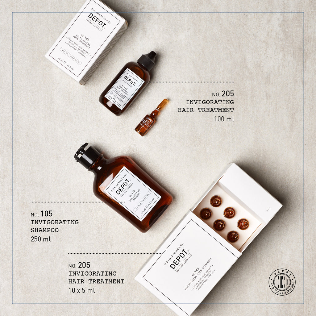 No. 205 Osnažujući tretman za kosu iz DEPOT-a je specijalizirani proizvod dizajniran za sprječavanje i suzbijanje prekomjernog gubitka kose. Formuliran je s mješavinom aktivnih sastojaka koji zajedno djeluju kako bi poboljšali mikrocirkulaciju vlasišta, čime štite i jačaju kosu od same lukovice. Ovaj tretman ima za cilj obnoviti zdrav životni ciklus kose. Ključne komponente uključuju ekstrakt indijskog kino drveta, poznatog po svojim anti-glikacijskim i antioksidativnim svojstvima, i ekstrakt ružmarina, koji ima antibakterijsko i dezodorirajuće djelovanje. Dodatno, ekstrakt arnike nudi umirujuće i regenerirajuće blagodati za vlasište, dok multivitaminski kompleks s vitaminima B5, B6, C, E i PP, zajedno s magnezijem i aluminijevim silikatom, pomaže hraniti i energizirati vlakno kose, dajući joj strukturu i kondicioniranje. Tretman je dostupan u pakiranju od 10 bočica, od kojih svaka sadrži 5 ml proizvoda, što ga čini prikladnim za redovitu upotrebu.