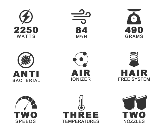 Uključivanje varijabilnog geometrijskog grijaćeg elementa s optimiziranim grijaćim područjima osigurava stabilnu raspodjelu temperature. Uz to, ugrađena tehnologija Air Ionizer i keramičke rešetke jamče zdravu kosu bez statičkog elektriciteta svaki put. Sušilo za kosu je presvučeno certificiranim antimikrobnim tretmanom koji je obogaćen srebrnim prahom. Ovaj jedinstveni premaz stvara nepovoljnu površinu za rast mikroorganizama i pomaže u održavanju higijene tijekom stalne uporabe.